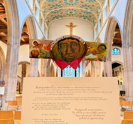 Spread throughout the Cathedral, the twelve stations bring together the creative talents of three artists from St Martin’s Church in North West London: painter Mark Cazalet, calligrapher Pansy Campbell, and poet Richard Leaf. Their combined work uses original artwork, evocative poetry, expressive calligraphy, and immersive audio to place the Nativity within the realities of 21st century life.